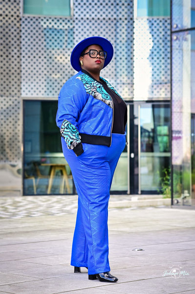 Coupe palazzo oversize, taille mi-haute avec ceinture en wax, poches latérales discrètes en imprimé wax.